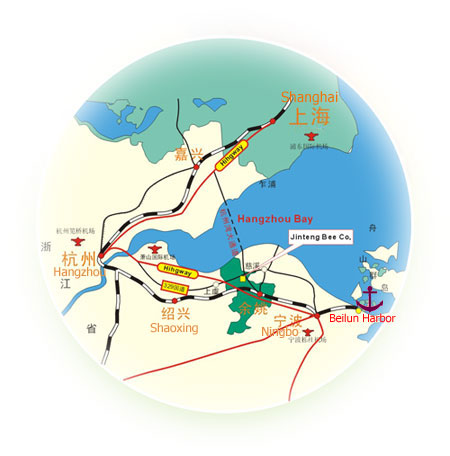 金腾蜂业有限公司坐落于中国宁波余姚,南距目前正在建造的世界第一大桥——杭州湾跨海大桥 20 公里,西距宁波北仑港 60 公里,东距杭州国际机场 100 公里。 329 国道北靠公司而过,南有杭甬高速公路直通杭州宁波。地理位置优越,交通极为便利。